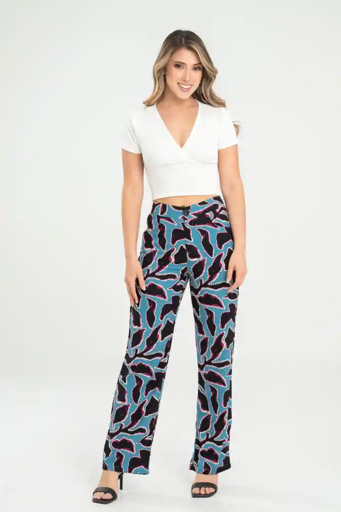 En Tejido Plano Estampado Talle Medio Pretina de 5 cms en la Parte Delantera Con Botón 36L y Cierre Con Elástico de 5 cms en la Parte Trasera. Bolsillos en la Parte Delantera Con Boca Redonda Bota Recta Ruedo de 2 cms Silueta Semi Ajustada.