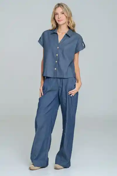 En Chambray Tiro Medio Tono Oscuro Pretina Con Elástico en Posterior Botón y Cierre en Frente Bolsillos en Diagonal y Parche en Posterior Detalle de Corte en Pierna.