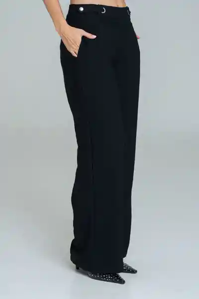 Pantalón en tejido plano fondo entero, talle medio, detalle de pretina delantera con ojaletes y charreteras con broche de tapa niquel, cierre semi invisible en costado, bolsillos en los laterales, bota ancha. ruedo de 2.5cms.