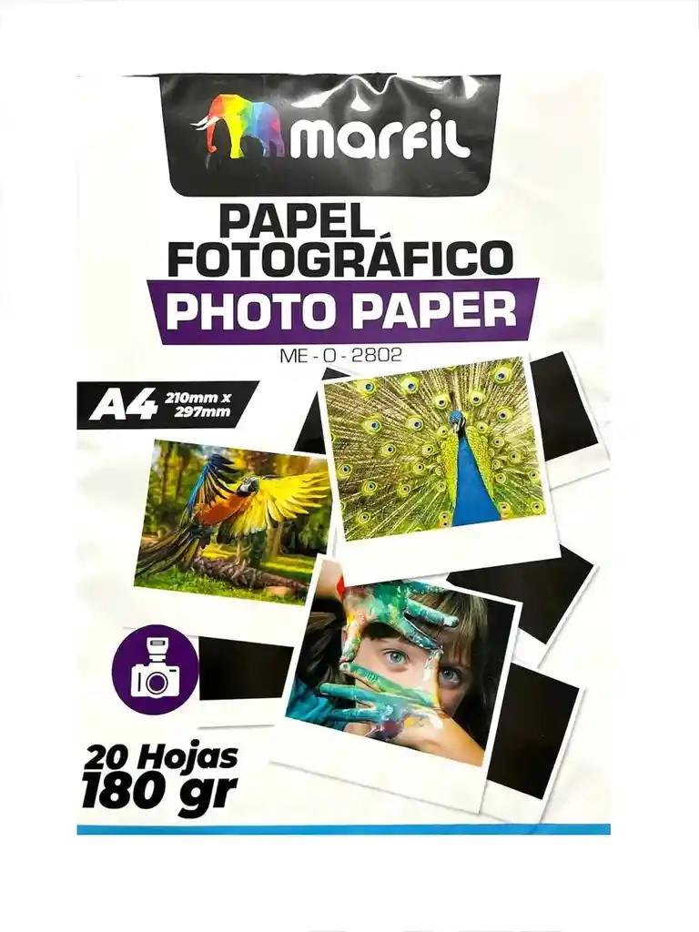 PAPEL FOTOGRAFICO DE 180 GRAMOS TAMAÑO A4 PAQUETE X 20 HOJAS BRILLANTES. MARCA MARFIL IDEAL PARA IMPRESORAS INKJET SECADO RAPIDO Y RESISTENTE AL AGUA EXCELENTE PARA EL DISEÑO DIGITAL E IMPRESION DE FOTOGRAFIAS