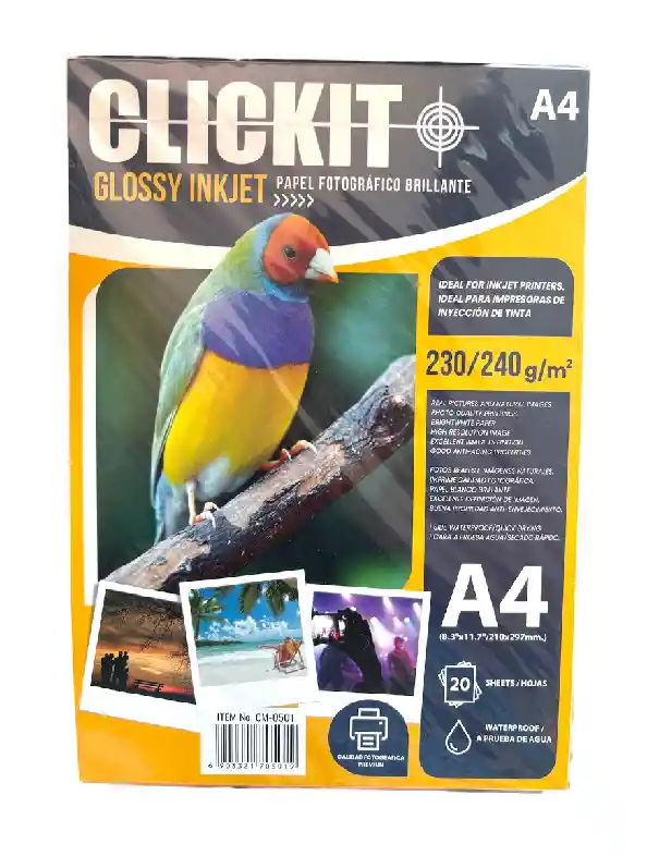 PAPEL FOTOGRAFICO 230 / 240 Grs PAQUETE POR 20 HOJAS TAMAÑO CARTA. IDEAL PARA IMPRESORAS INKJET, SECADO RAPIDO. Excelente definicion de imagen, buena propiedad anti-envejecimiento. TAMAÑO A4