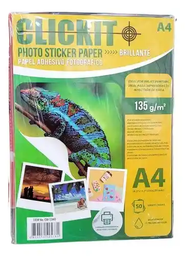 PAPEL FOTOGRÁFICO ADHESIVO CLICKIT 135 G A4 X50 HOJAS. IDEAL PARA IMPRESIONES A COLOR, ETIQUETAS, MANUALES Y PROYECTOS CREATIVOS. SUPERFICIE BRILLANTE, SECADO RÁPIDO Y EXCELENTE ADHERENCIA.