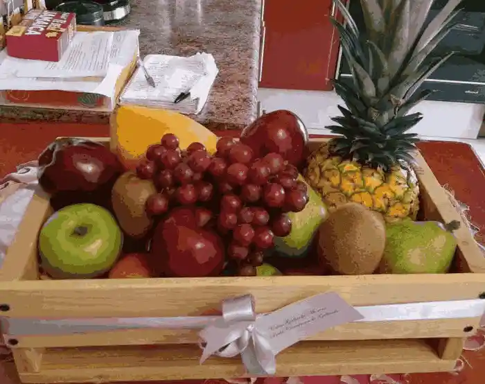 Contenido: 1 Ramo de uvas 1 Papaya Pequeña 2 Manzanas 3 Naranja 2 Kiwis 1 Pera 1 Bandeja de Madera 1 Decoración del Dia