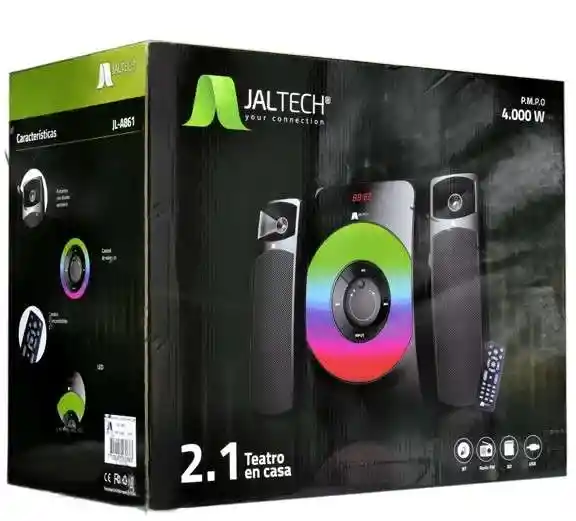 Sistema de parlantes Bluetooth con subwoofer que ofrece sonido potente y graves profundos, ideal para música, películas y juegos desde celulares, computadores o televisores
