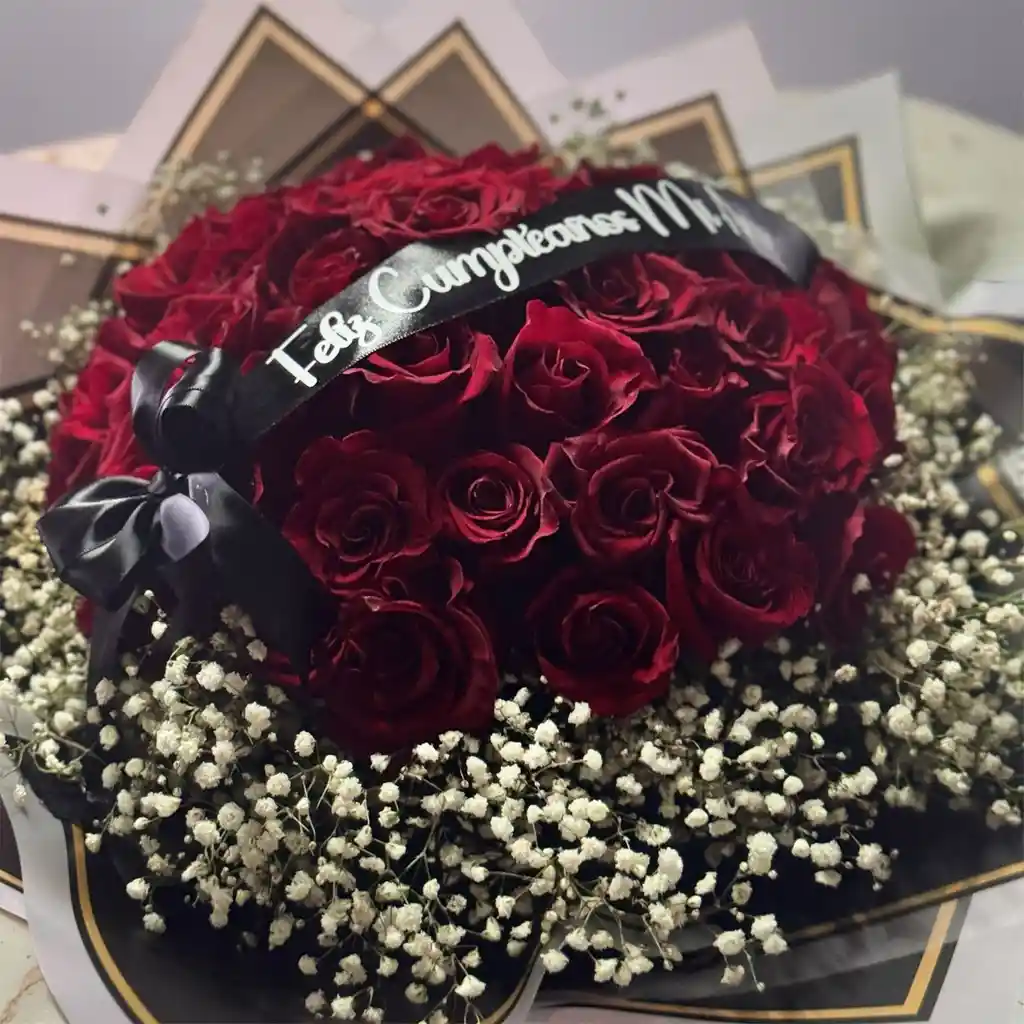 🌹❤️🔥Impacta con un detalle que desborda romance y sofisticación. En Loren's Floristería,🌹❤️🔥 elevamos el concepto del ramo tradicional con este bouquet de gran formato, diseñado para cautivar todos los sentidos y marcar un momento eterno. La magnificencia de esta pieza se encuentra en sus detalles: Corazón Majestuoso: Una impresionante composición de 48 Rosas Rojas premium, seleccionadas por su apertura perfecta y su color rojo profundo y apasionado. Halo de Luz: El arreglo está rodeado por una abundante base de Perla (Gypsofila), que crea un contraste blanco y vaporoso, realzando la intensidad de las rosas como si flotaran en una nube. Mensaje Personalizado: Coronado con una elegante cinta negra satinada con letras blancas que dicta un "Feliz Cumpleaños", añadiendo un toque de exclusividad y personalización directa. Envoltorio de Alta Costura: Sellado con Papel Coreano en tonos oscuros con bordes dorados, que proporciona una estructura firme, moderna y un acabado de boutique internacional. Es el regalo definitivo para aniversarios de oro, declaraciones de amor o cumpleaños donde solo lo mejor es suficiente.