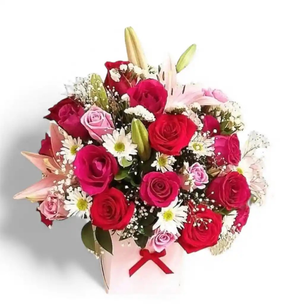 Arreglo con rosas , lirios , margarita , eucalipto y gipsofilia