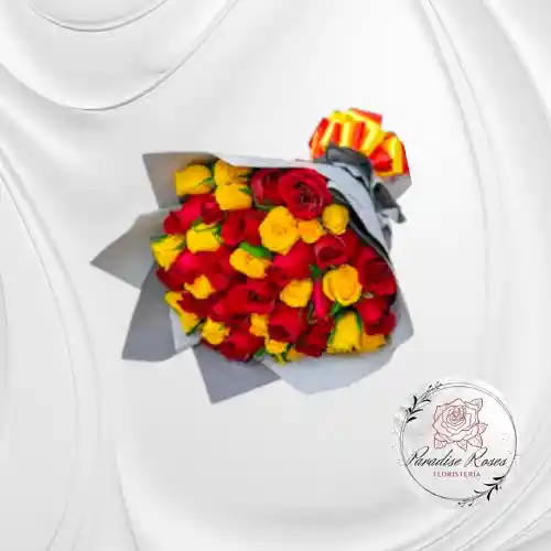 Un ramo de 48 rosas rojas con la alegría del amarillo, creando una fusión perfecta entre pasión, energía y felicidad contagia vitalidad. Ideal para expresar sentimientos profundos con un toque de optimismo. Aniversarios o celebraciones románticas. Detalles para enamorar o sorprender a alguien especial.