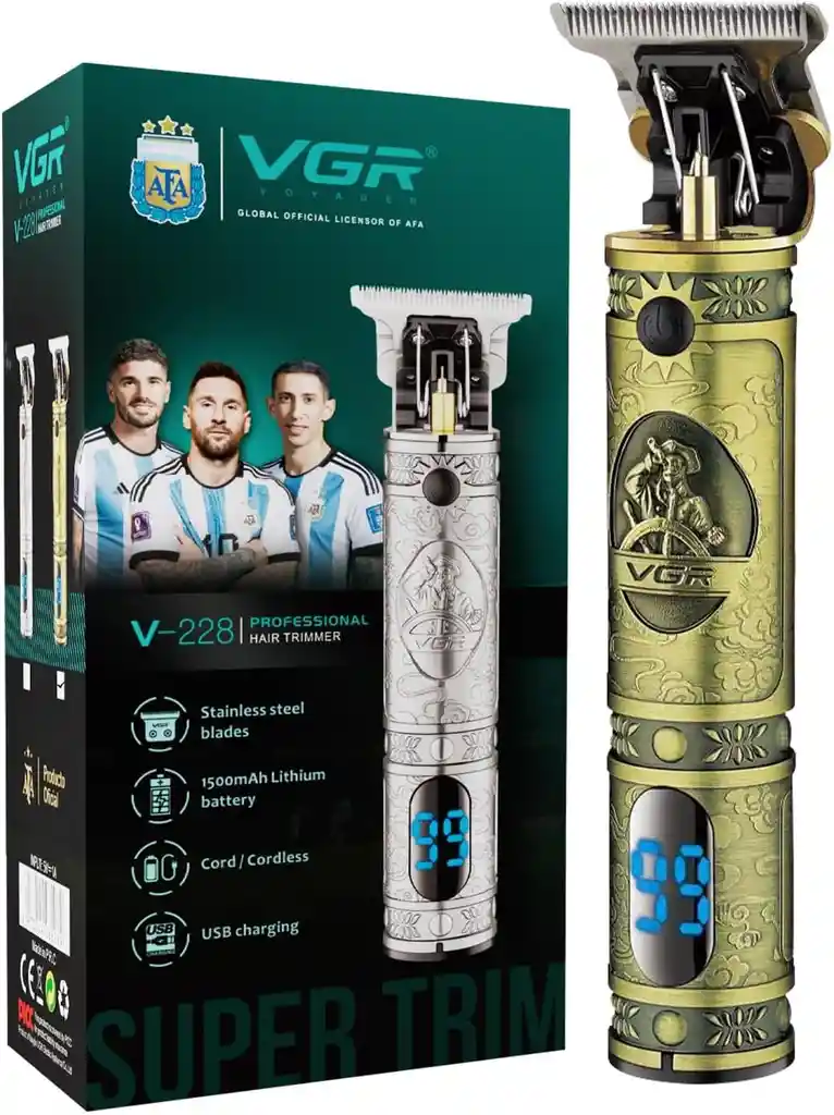 máquina recortadora de cabello y barba marca VGR, modelo V-228. Tipo: Recortadora inalámbrica (Trimmer) con diseño vintage metálico. Características: Incluye una pantalla LED para visualizar la carga de la batería y cuchillas en forma de T para cortes precisos. Batería: Cuenta con una batería de litio que ofrece hasta 180 minutos de funcionamiento continuo y se carga mediante puerto USB. Accesorios: El kit incluye tres guías de corte ajustables de diferentes tamaños.