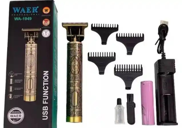 Patillera Waer Recargable Profesional Dorada La patillera Waer WA-1949 Doradda es una recortadora profesional inalámbrica elegante y potente. Compatible con oltajes de 110V a 240V, se adapta tanto a entornos domésticos como profesionales, y es ideal para viajes. Su acabado dorado le aporta estilo y distinción sin comprometer el rendimiento. Beneficios -Voltaje global y versatilidad: funciona en 110V y 240V, perfecta para uso en cualquier lugar. -Bateria recargable de larga duración: ofrece hasta 180 minutos de uso continuo con una carga apróximada de 2,5 horas. -Diseño compacto y portátil: ideal par llevar en viajes, con cabezales lavables que facilitan su limpieza. -Cuerpo durable y cómodo: estructura metálica robusta que aporta firmeza y diseño premium.
