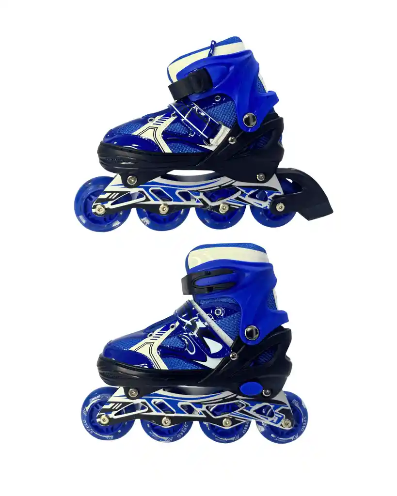 Patines talla M (equivalente a calzado 35 a 37) en color azul, ideales para principiantes y uso recreativo. Incluyen protecciones completas: rodilleras, coderas, muñequeras y casco para mayor seguridad. Vienen con mochila práctica para guardar y transportar todo fácilmente.