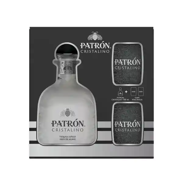 Contiene 3 Unidades. Patron Tequila Cristalino 700 mL + Copas Volcánicas 2 Und.