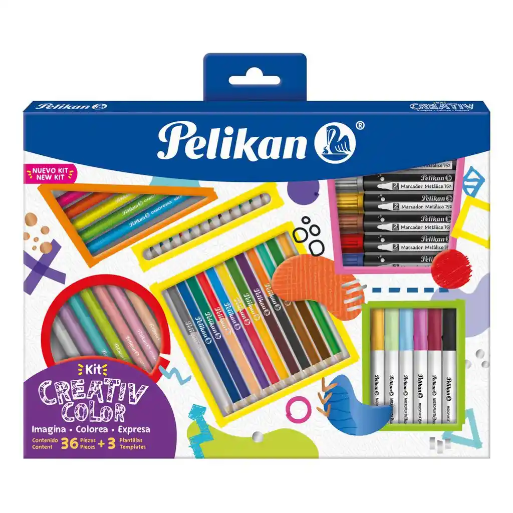 Kit Creative Color x 36 Unidades | Incluye: 12 plumones, 12 colores, 6 marcadores metálicos, 6 micropuntas y 3 plantillas para personalizar | Marca: Pelikan | Uso: escolar, artístico y manualidades | Material: tinta base agua | Ideal para papel y cartulina | Hecho en Colombia.