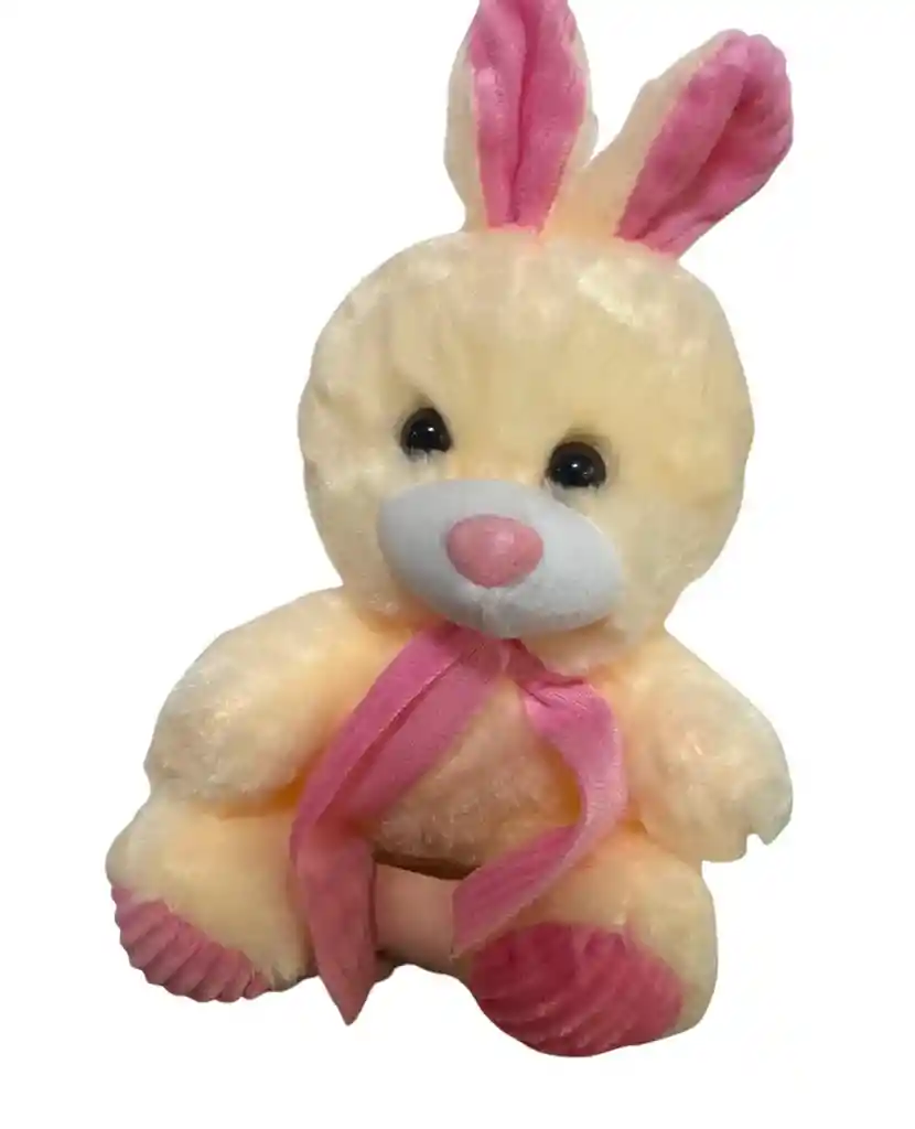 Este producto es un peluche de conejito confeccionado en felpa suave de tono crema con detalles en rosa que resaltan su ternura. Su diseño incluye largas orejitas rosadas, una nariz en forma de corazón del mismo color y un hocico gris claro que contrasta con sus ojitos negros brillantes. Como detalle encantador, lleva un lazo de tela rosa alrededor del cuello que lo hace aún más adorable. Además, sus patitas cuentan con aplicaciones de tela rosada que combinan perfectamente con su estilo. Es un regalo ideal para transmitir dulzura en ocasiones especiales como cumpleaños, San Valentín, Pascua o simplemente para dar un detalle lleno de cariño