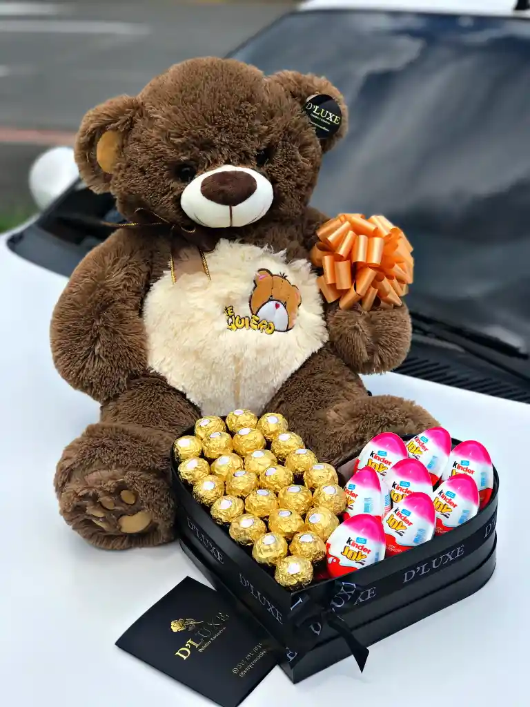Peluche puede variar según disponibilidad (solo es como referencia) caja con kinders y ferreros. Tiempo de elaboración: 1:30h/2h