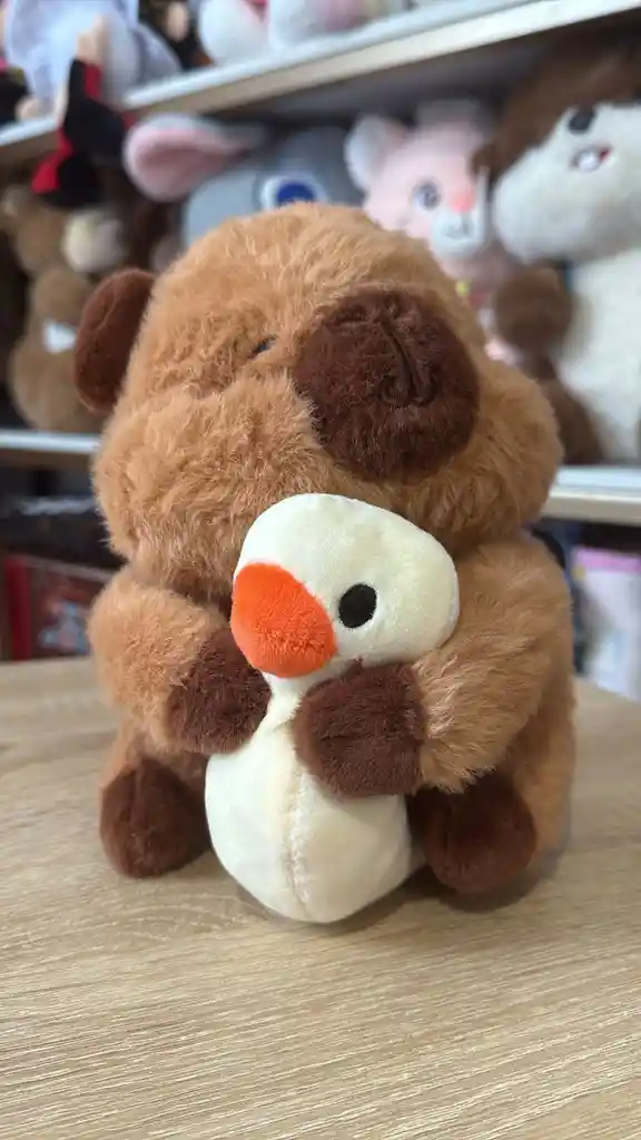 Peluche de capibara en posición sentada, color marrón con hocico oscuro. Sostiene entre sus patas delanteras un pequeño pato blanco con pico naranja. Rostro con ojos entrecerrados bordados. Felpa de poliéster de textura muy suave y esponjosa, con relleno de algodón siliconado de alta calidad.