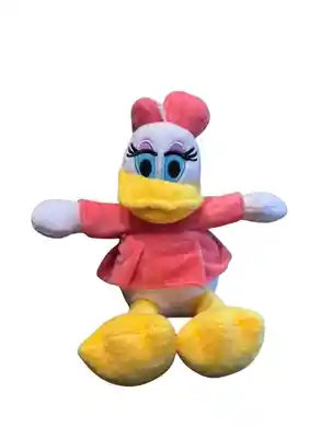 Daisy con vestido rosa y moño a juego, mirada tierna y pies amarillos.