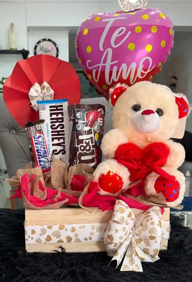 Contiene: peluche x1 ( puede variar según disponibilidad ) , caja de madera, globo de corazón, MM x1, Hershey´s x1, snicker´s x1, decoracion y mensaje personalizado