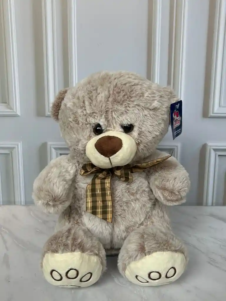 Peluche de Oso de color gris con moño, de un tamaño aproximado de 26 cm. Pidelo con un mensaje personalizado!