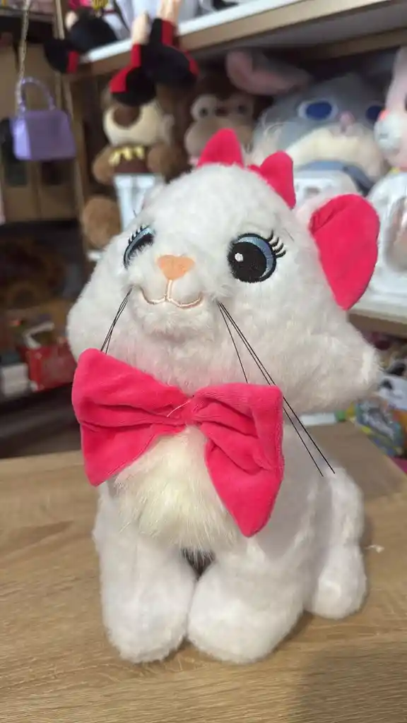 Peluche de la gatita Marie de la película "Los Aristogatos". Color blanco puro con un gran lazo rosa fucsia al cuello y otro más pequeño en la cabeza. Rostro con ojos azules bordados, pestañas largas, nariz rosada y bigotes negros de hilo rígido. Posición sentada. Felpa suave de poliéster de fibra corta y detalles en tela aterciopelada para los lazos. Relleno de algodón siliconado.