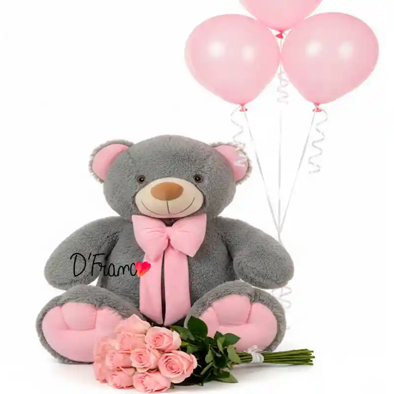 Oso de peluche mide 1 metro, incluye moño de regalo, globos en helio y flores. Deja tu mensaje para la tarjeta