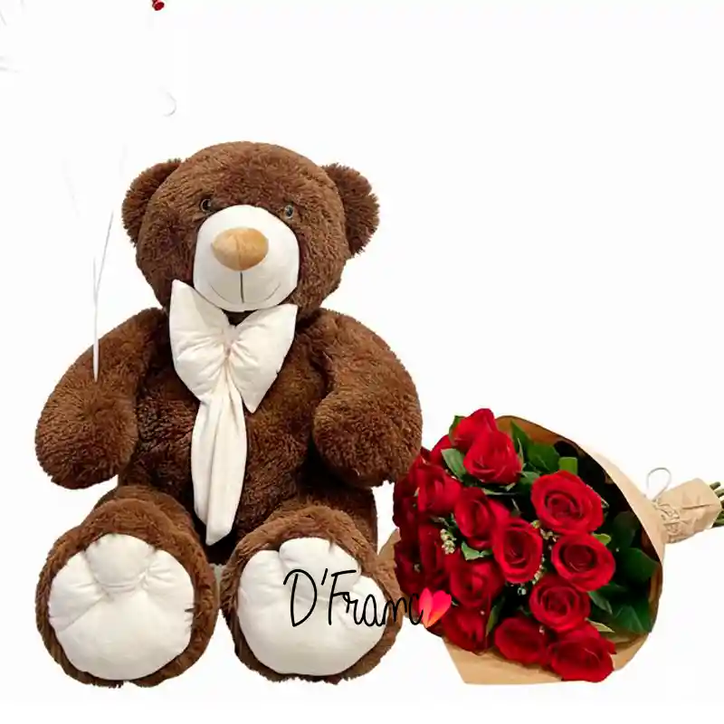 Oso de peluche mide 1 metro Cali a domicilio, es hermoso incluye ramo de rosas, globos en helio, moño de regalo y una linda tarjeta.