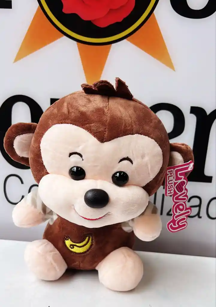 Peluche de monito café, suave y esponjoso, con carita sonriente y detalle de banana bordada. Ideal para regalar. 🐵💛