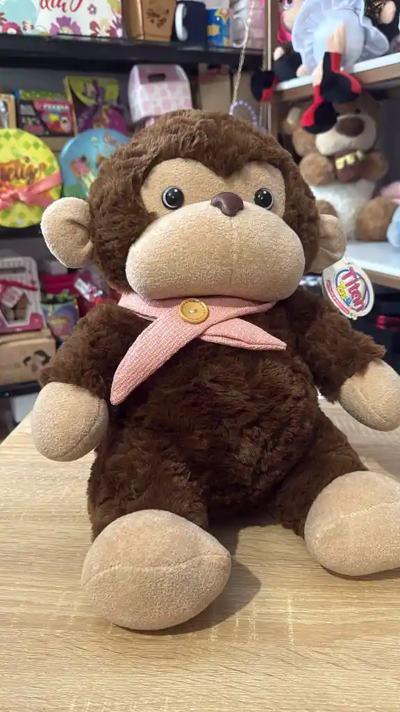 Peluche de simio en posición sentada. Pelaje de color café oscuro texturizado, con rostro, manos, pies y orejas en color beige contrastante. Viste una pañoleta de tela rosada con un botón de madera decorativo en el centro. Ojos negros brillantes y nariz de plástico marrón. Felpa de poliéster de alta densidad (pelo rizado), tela de lino para la pañoleta y relleno de algodón siliconado.