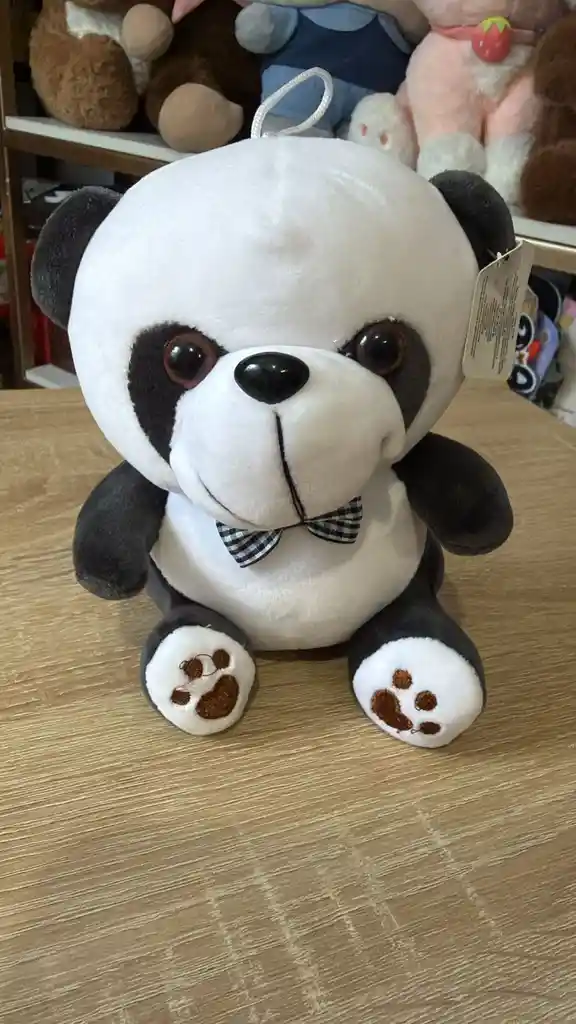 Peluche de panda bicolor (blanco y negro) en posición sentada. Presenta un corbatín pequeño con patrón de cuadros blancos y negros, ojos marrones brillantes y detalles de huellas bordadas en café sobre las patas blancas.