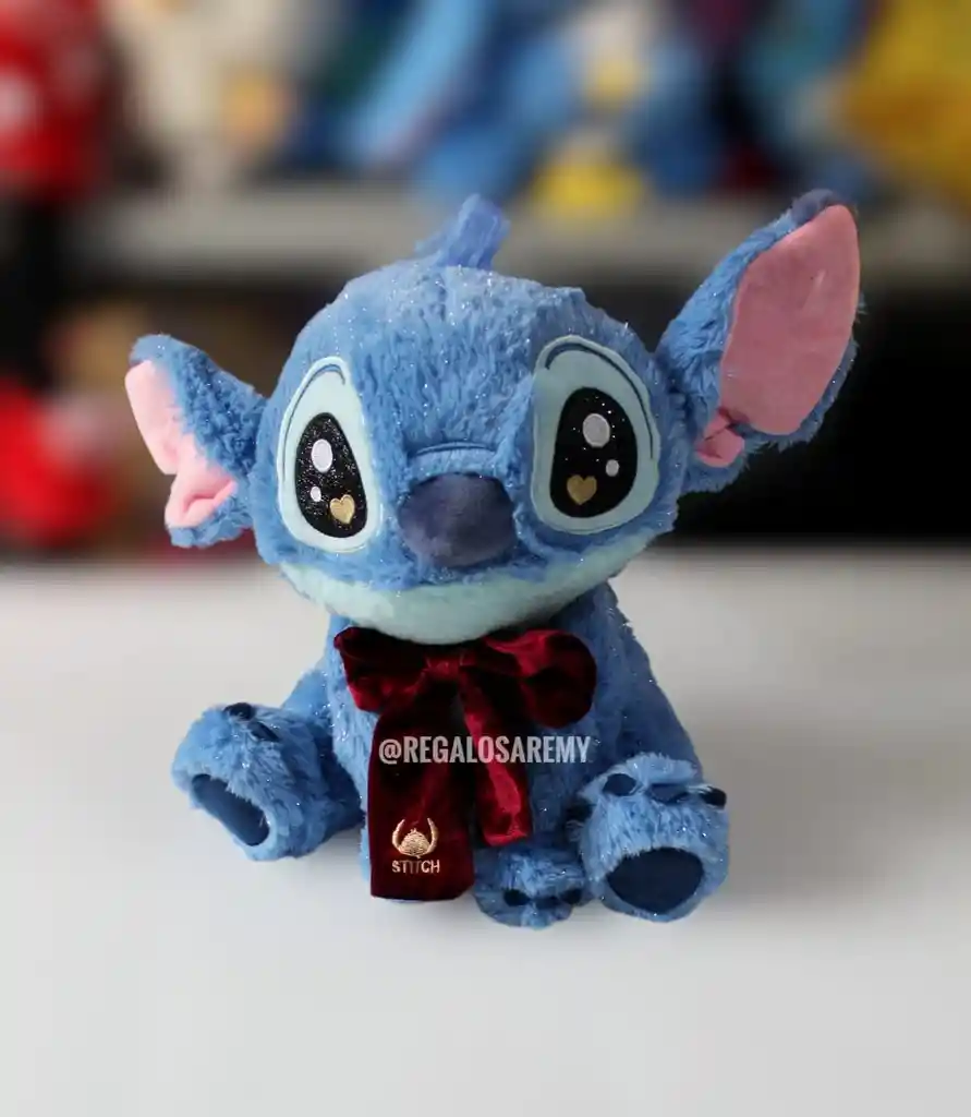 Incluye bolsa de regalo y moño Tierno peluche de Stitch con elegante corbatín color vinotinto. 📏 Tamaño aproximado: 30 cm de alto, largo 47cm, ancho: 36cm Perfecto para regalos de cumpleaños, aniversarios o detalles románticos.