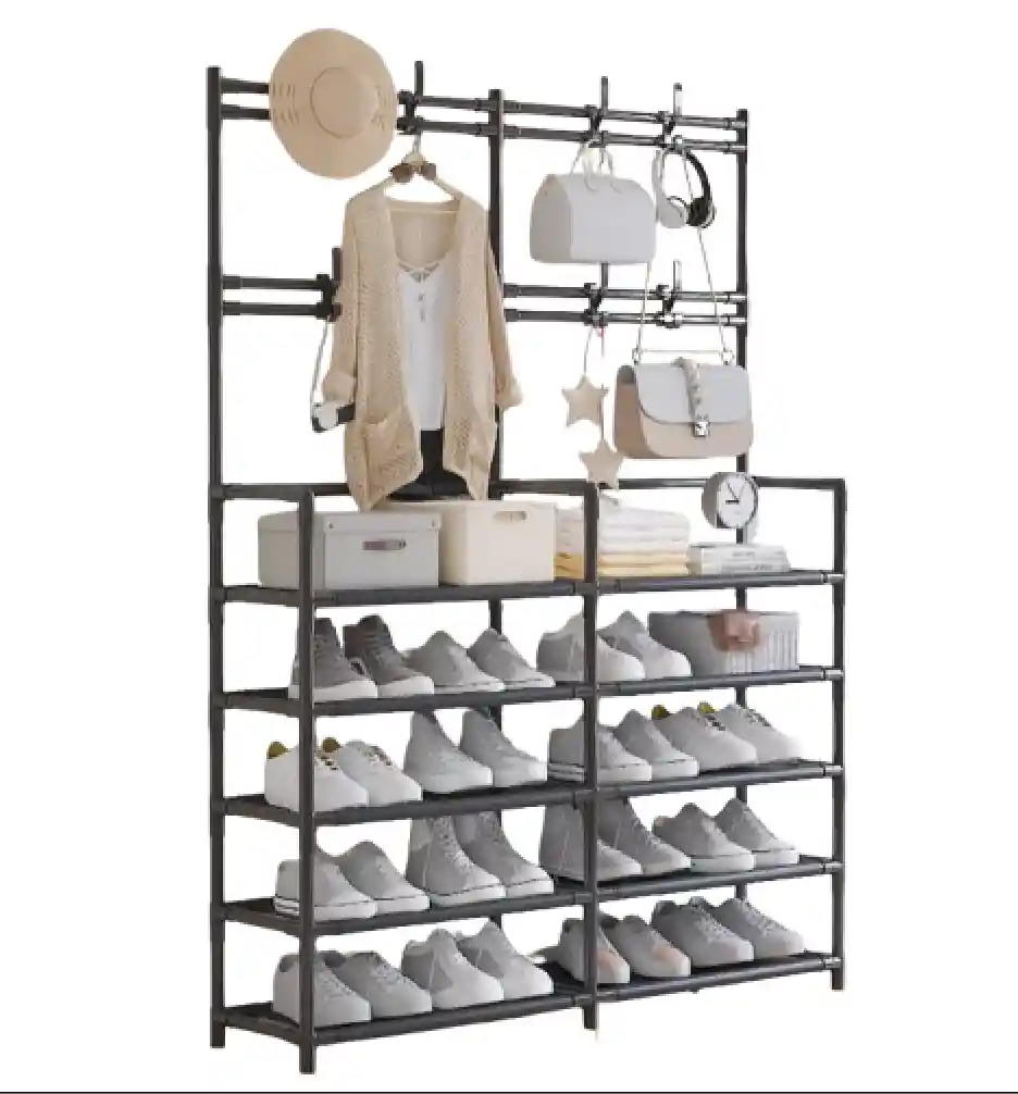 🪑👟 Perchero Zapatero Doble 5 en 1 | Organizador Multifuncional Transforma tu entrada en un espacio limpio, ordenado y elegante con este organizador 5 en 1. Diseñado para quienes buscan ahorrar espacio y mantener todo en su lugar, combina perchero, zapatero y estantes en un solo mueble práctico. 🔑 Beneficios principales: 🧥 2 en 1 práctico y elegante: perchero + zapatero en un solo diseño. 👟 Hasta 20 pares de zapatos: 10 niveles inferiores que mantienen todo ordenado. 🎒 8 ganchos superiores: perfectos para mochilas, bufandas, paraguas, llaves y chaquetas. 🏠 Ahorra espacio: su estructura vertical aprovecha cada rincón de tu entrada, pasillo o sala. 🛠️ Fácil instalación: incluye instrucciones claras y no requiere herramientas adicionales. 🏗️ Estable y duradero: estructura de doble fila para mayor resistencia y soporte. 📐 Especificaciones: Dimensiones: 89 cm x 29,5 cm x 176 cm (35.03” x 11.61” x 69.48”) Capacidad: hasta 20 pares de zapatos + 8 ganchos Material: acero resistente y tableros de madera MDF Colocación ideal: entrada, pasillo, vestíbulo, oficina, sala de estar ✅ Organiza y ahorra espacio en un solo paso. ✅ Ideal para familias, departamentos pequeños y oficinas. ✅ Diseño minimalista que combina con cualquier decoración.