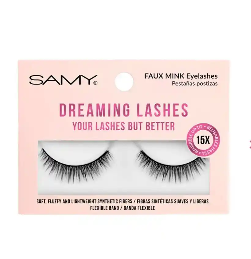 En el empaque dice “Dreaming Lashes” y “Your lashes but better”, lo que indica que son pestañas de efecto natural. Son de fibras sintéticas, suaves, ligeras y con banda flexible para facilitar su aplicación. También menciona que son reutilizables hasta 15 veces. Las pestañas son largas, con volumen ligero y un acabado esponjoso, ideales para darle más definición a la mirada sin que se vean demasiado exageradas