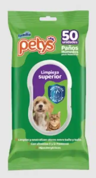 Los Paños Húmedos Petys son toallitas húmedas para la limpieza de perros y gatos entre baños, ideales para retirar suciedad y ayudar a neutralizar olores sin necesidad de enjuague. Sirven para limpiar patas, pelaje, orejas y el contorno de los ojos con una acción suave que deja una fragancia agradable. Están formulados con pH neutro y componentes que ayudan a cuidar la piel y el pelo durante el uso frecuente.