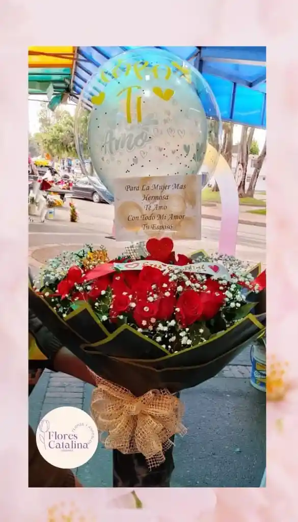 Delicado bouquet rojo, con follajes, yipso blanca, envoltura delicada, globo personalizado y moño fino