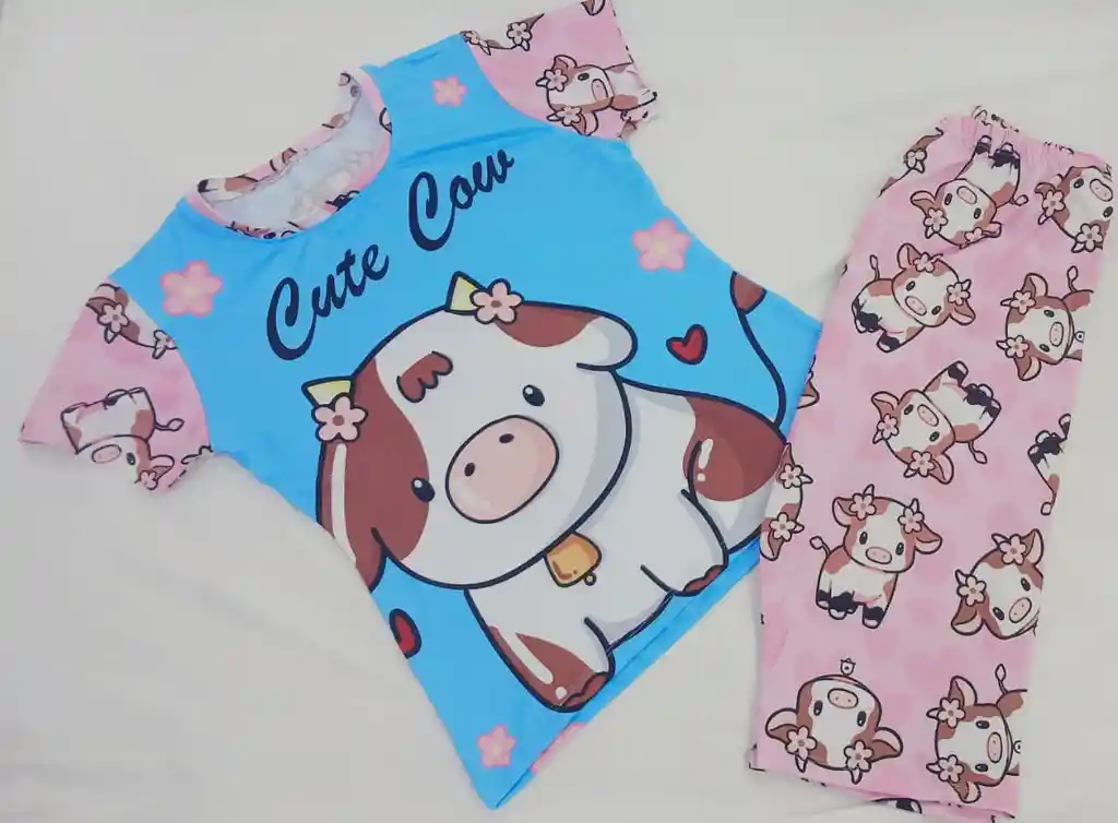 🐮 Diseño Cute Cow con estampado tierno 👚 Conjunto de 2 piezas: camiseta manga corta + pantalón largo 🧵 Tela suave, fresca y cómoda al tacto 🌙 Ideal para dormir o estar en casa 👖 Pantalón largo con ajuste cómodo 🎨 Colores llamativos y estampado juvenil 👗 Horma normal, no ajusta 📌 Referencia: Vaquita 📌 Uso: Pijama / Ropa de descanso 📌 Género: Dama