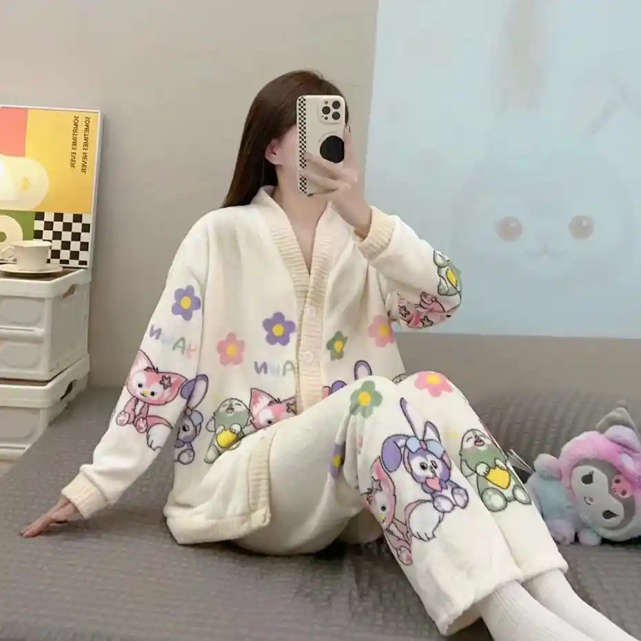 Talla: Única adulto Material: Piel de durazno Incluye: 1x Camiseta manga larga con botón 1x Pantalón *Imagen de referencia. Importante: Debido a la diferencia de pantallas y efecto de la luz, el color real del artículo puede ser ligeramente diferente al color mostrado en las imágenes.