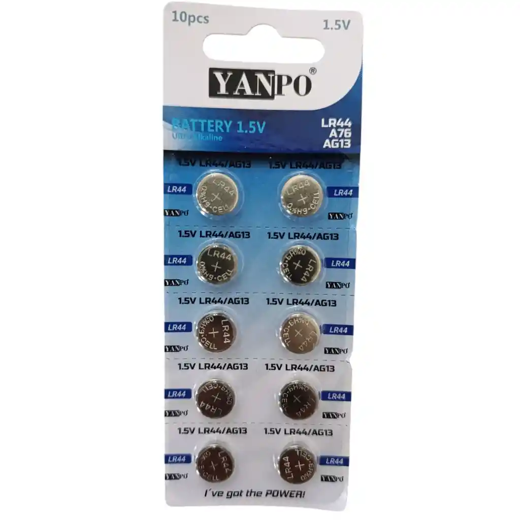 DESCRIPCION Las baterías tipo botón LR44, AG13, A76 son una solución confiable y duradera para una variedad de dispositivos electrónicos, desde relojes hasta juguetes y dispositivos médicos. Con una potencia de 1.5V, estas baterías proporcionan un rendimiento estable y de larga duración. CARACTERISTICAS * Tipo de batería: LR44 AG13 A76 * Voltaje: 1.5V. * Paquete de 10 unidades. * Compatibles con varios dispositivos electrónicos. * Larga duración y rendimiento estable. * Tamaño compacto y fácil de almacenar. * Ideal para relojes, juguetes y dispositivos médicos. * Tecnología de larga vida útil. * Conveniente y económico paquete de múltiples unidades. QUE INCLUYE LA COMPRA: x10 Baterias