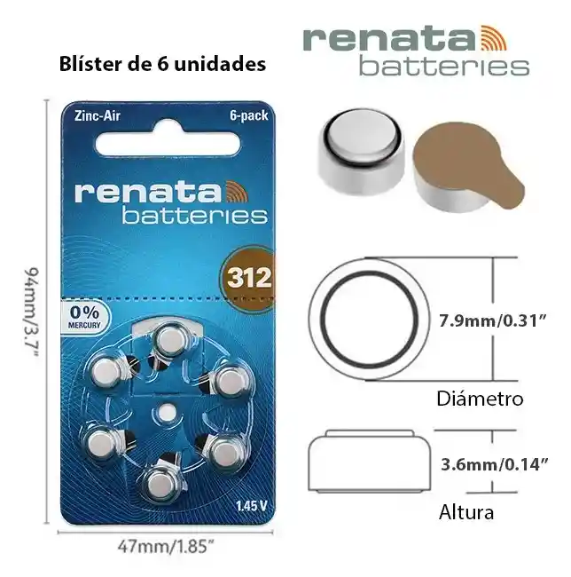 La Pila Renata 312 1.45V es una de las más confiables del mercado para audífonos modernos gracias a su tecnología Zinc-Air, que ofrece un rendimiento estable, limpio y prolongado. Este blister incluye 6 unidades, ideales para garantizar que siempre tengas repuestos a la mano. Diseñadas especialmente para audífonos digitales y análogos, las pilas Renata brindan una entrega de energía constante, mejorando la calidad del sonido y prolongando la vida útil de tus dispositivos auditivos. Su activación es rápida, su desempeño es uniforme y su duración es superior, incluso en usos intensivos. Perfectas para personas que necesitan máxima claridad de audio, confiabilidad diaria y energía segura. Renata es una marca suiza reconocida mundialmente por su calidad, ofreciendo pilas que se destacan por su gran autonomía, seguridad y compatibilidad universal. Si deseas rendimiento, seguridad y calidad premium, ¡este pack de Renata 312 es la mejor opción para tus audífonos!
