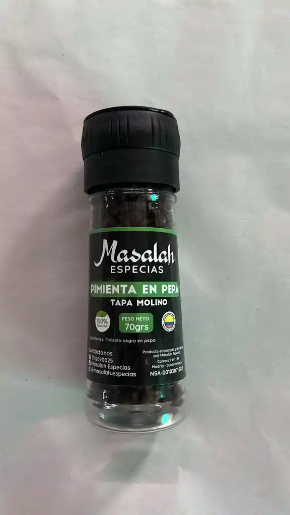 Pimienta negra en pepa Masalah: -Incluye moledor en tapa -Peso neto 70 gramos