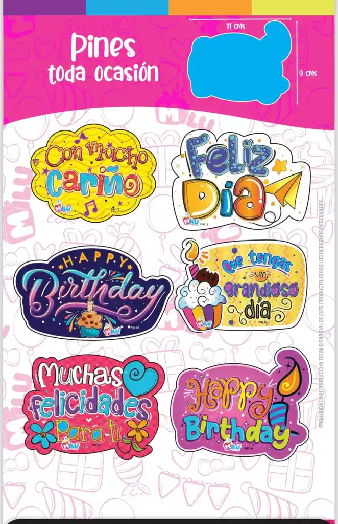 🎉✨ Pines Decorativos Toda Ocasión ✨🎉 ¡Dale vida y color a tus detalles con estos pines grandes y llamativos! 💖🎂 🔸 Descripción para venta por unidad: Pines decorativos con diseños modernos y mensajes para toda ocasión como “Feliz día”, “Happy Birthday”, “Muchas felicidades para ti” y “Con mucho cariño”. Perfectos para resaltar tus regalos, tortas, anchetas o sorpresas especiales 🎁🌈 🔸 Características: ✔ Tamaño aproximado: 11 cm x 9 cm ✔ Diseños surtidos, coloridos y llamativos ✔ Incluyen palito para fácil uso ✔ Material resistente y liviano ✔ Listos para decorar al instante 🔸 Ideal para: 🎂 Tortas y cupcakes 🎁 Regalos y anchetas 🎉 Decoraciones de fiestas 💝 Detalles personalizados
