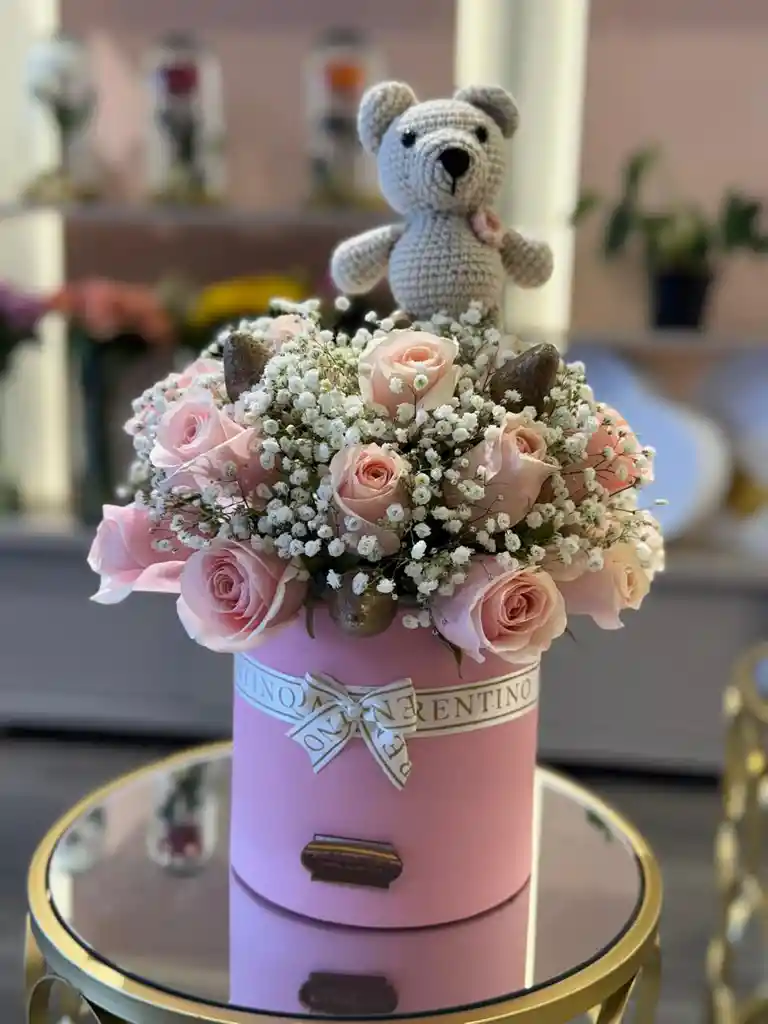 Un elegante arreglo con rosas y velo de novia que transmite sentimientos profundos con un toque único y sofisticado. El detalle ideal para sorprender a esa persona especial en cualquier ocasión. DESCRIPCIÓN Una fusión delicada entre rosas premium, finos toques de velo de novia y la dulzura única de las fresas cubiertas en chocolate, decorado con un tierno oso tejido a mano. Un detalle lleno de ternura y elegancia. INCLUYE - Tarjeta personalizada sin costo adicional. - Oso tejido a mano.
