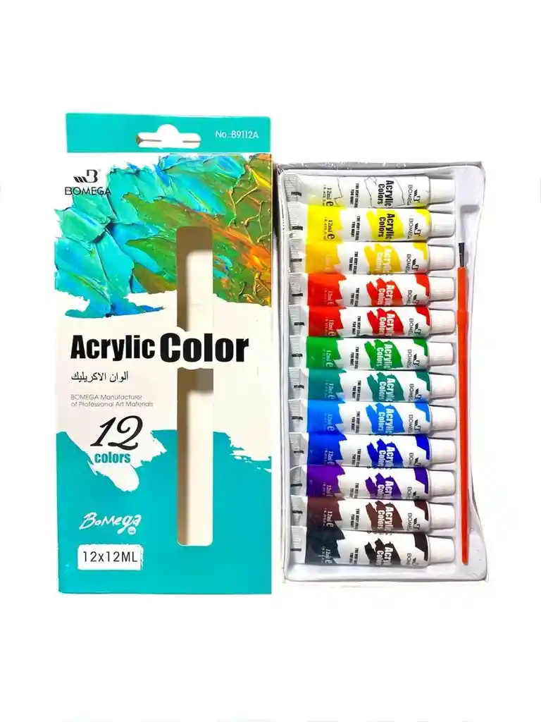 🎨 Pintura Acrylic Color marca Bomega Caja X 12 Colores de 12 ml cada uno. El color acrílico BOMEGA es un tinte especialmente adecuado para trabajar con materiales y en relieve. El color se puede utilizar directamente del tubo o con medios acrílicos BOMEGA. Se adhiere fuertemente y no se desvanecerá después del secado. Ref B9112a