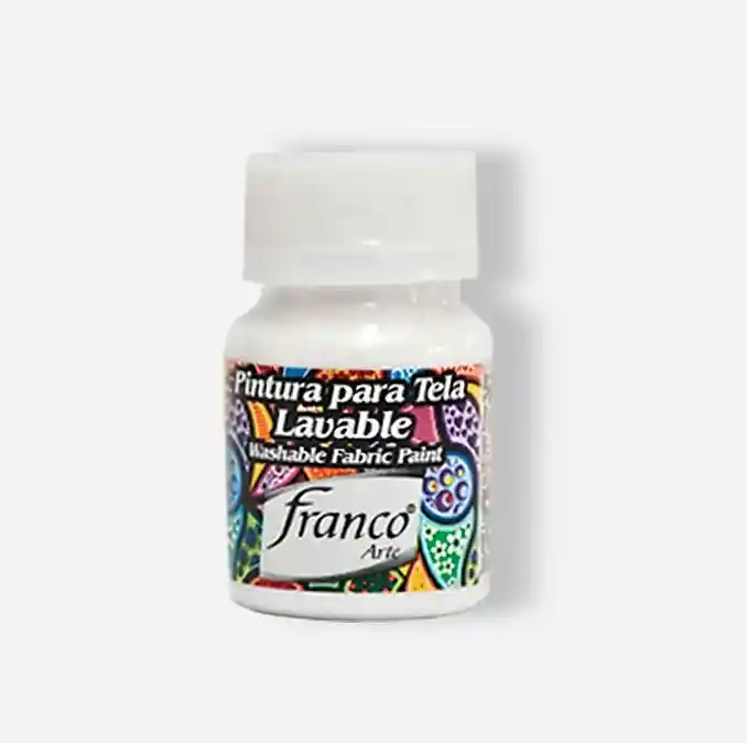 PINTURA PARA TELA FRANCO ARTE ideal para pintar y estampar tela. Súper flexible, buen cubrimiento. No acartona la tela. Es recomendable lavar previamente la tela antes de pintar para eliminar polvo y grasa. Dejar secar por 72 horas y planchar por el revés a temperatura media. Manténgase fuera del alcance de los niños. Agite antes de usar. Contiene: 30 cm3
