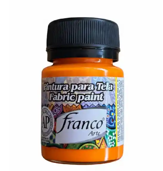 Pintura Para Tela Resistente Al Lavado 30 Cc Naranja. "PINTURA PARA TELA FRANCO ARTE ideal para pintar y estampar tela. Súper flexible, buen cubrimiento. No acartona la tela. Es recomendable lavar previamente la tela antes de pintar para eliminar polvo y grasa. Dejar secar por 72 horas y planchar por el revés a temperatura media. Manténgase fuera del alcance de los niños. Agite antes de usar. Contiene: 30 cm3"