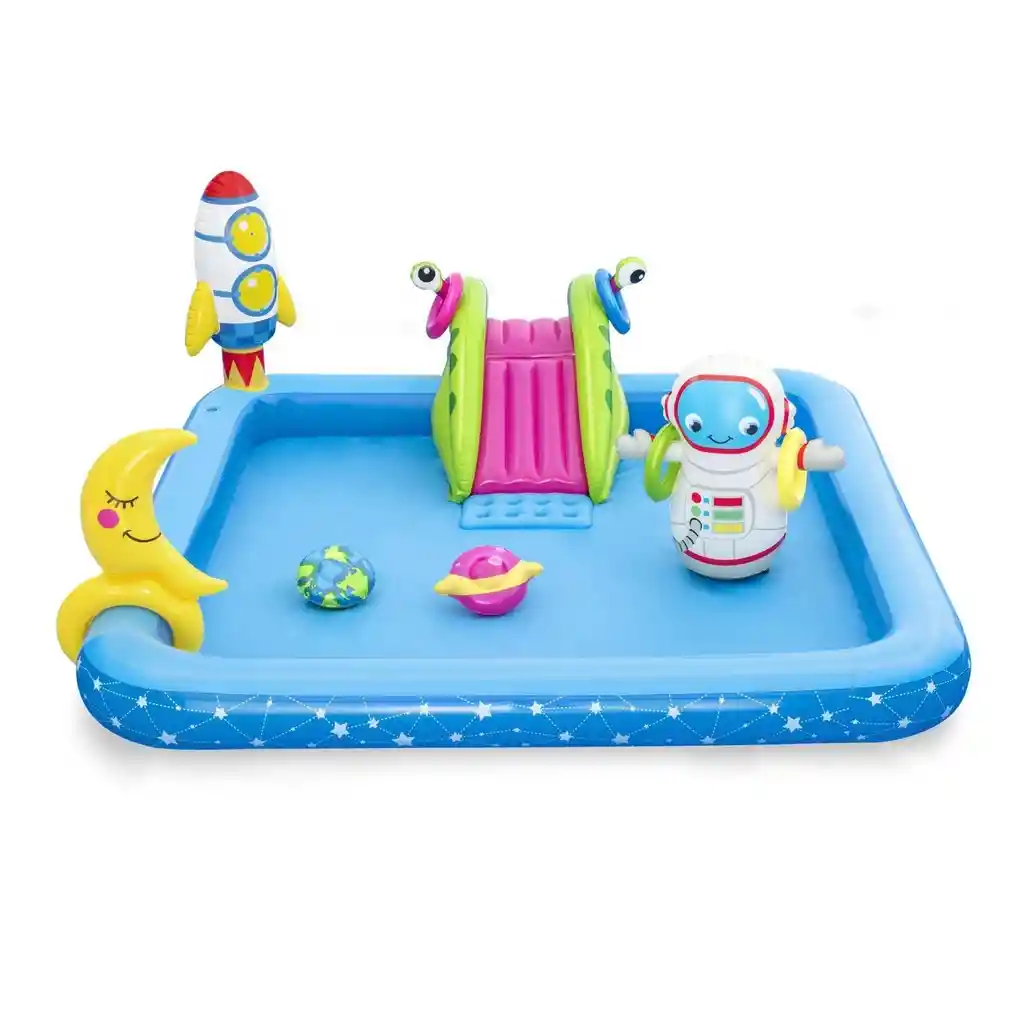 Bestway es una empresa con larga trayectoria que busca crear diversión y experiencias agradables para sus usuarios. Esta marca se destaca por mejorar continuamente sus procesos de investigación, sus diseños y el desarrollo de sus productos para garantizar la mejor calidad en sus piscinas. ¡Para los más chicos! Su capacidad de 308 litros la convierte en un lugar de diversión apto para niños y niñas a partir de 2 años de edad, que podrán jugar, zambullirse y disfrutar horas en el agua. Contenido de la caja: una piscina, un punch, un lanzamiento de anillo lunar, un frisbee terrestre, un frisbee planetario, cuatro anillos y un parche de reparación. Ficha Técnica: - Dimensiones : 2.28 m x 2.06 m x 84 cm - Material: Vinilo PVC - Edad: 2+ Años - Capacidad de agua 308 L ( 81 galones) Términos de garantía: Para defectos de fábrica o retractos: Por favor revise el producto apenas lo reciba y antes de usarlo. No aplican ley de retracto o defectos de fábrica luego de usar el producto. Se manejan máximo 5 días para reportar defectos de fábrica (por ejemplo, producto funciona mal, piezas faltantes, rotas, etc). Para hacer efectiva la devolución el producto debe devolverse con el empaque original, el cual debe estar en buen estado, incluir todos los documentos y las partes completas y sin daños.