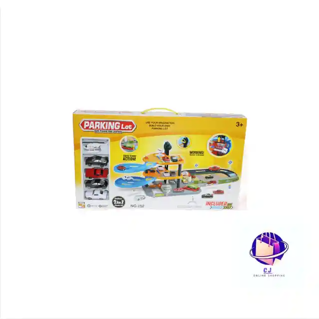 Pista de estacionamiento de juguete con diseño divertido y colorido. Incluye 4 carros y 1 helicóptero, con rampas y espacios para estacionar. Fabricada en material resistente y liviano, ideal para el entretenimiento y juego creativo de los niños.