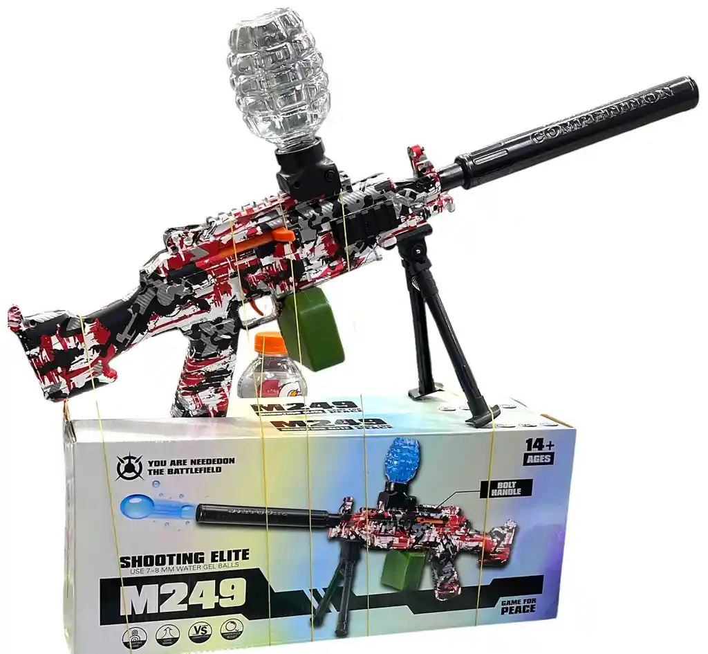 La Arma Ametralladora MP9,M516,M249 de hidrogel es un juguete popular entre niños y jóvenes. Suele estar diseñada para ofrecer una experiencia divertida y segura. Aquí tienes información sobre este tipo de juguetes: Características principales: Material seguro: Las balas de hidrogel están hechas de un material no tóxico que se disuelve al impacto o al secarse, lo que facilita la limpieza y reduce riesgos. Diseño realista: La réplica del MP5 puede incluir detalles que imitan el arma original, pero suele tener colores vivos o transparentes para cumplir con normas de seguridad y evitar confusiones. Funcionamiento: Muchas funcionan con un sistema de resorte o motorizado, lo que permite disparar balas de hidrogel a corta distancia. Alcance moderado: Estas armas suelen tener un alcance de entre 10 y 20 metros, ideal para juegos al aire libre. Beneficios: Fomenta el juego activo y la socialización. Estimula la coordinación ojo-mano y la motricidad. Es una opción económica y segura en comparación con otros juguetes similares. Precauciones: Usar bajo supervisión de un adulto, especialmente para niños pequeños. No disparar a la cara o los ojos. Es recomendable usar gafas protectoras.