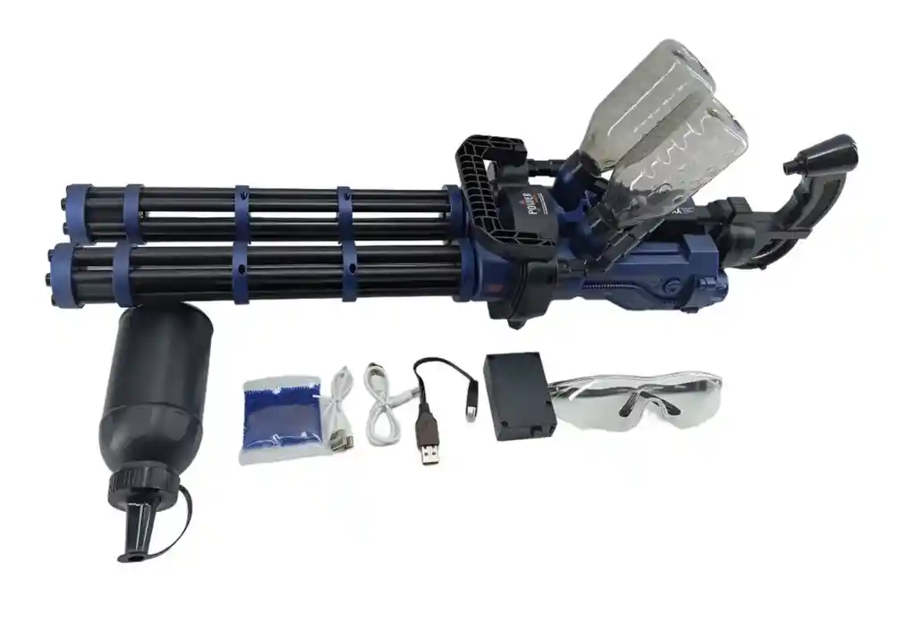 Pistola hidrogel ametralladora con gafas de protección, bolsa hidrogel, doble disparo. Batería recargable. Colores: azul, verde y dorado