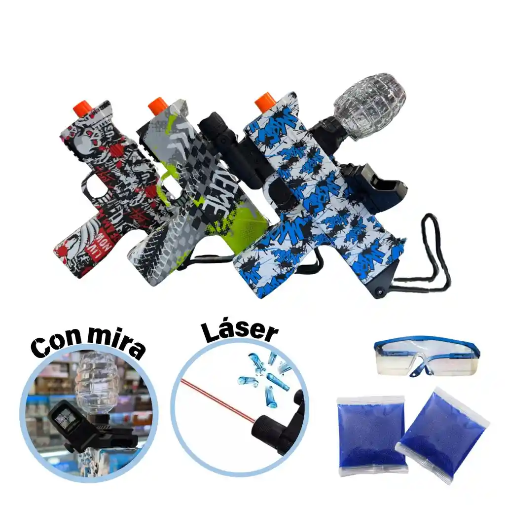 Pistola hidrogel mini uzi con gafas de protección 2 bolsas hidrogel 2 envases para munición 1 mira y puntero laser rojo. Colores: Según disponibilidad verde, roja y azul. Batería recargable de 7.4V