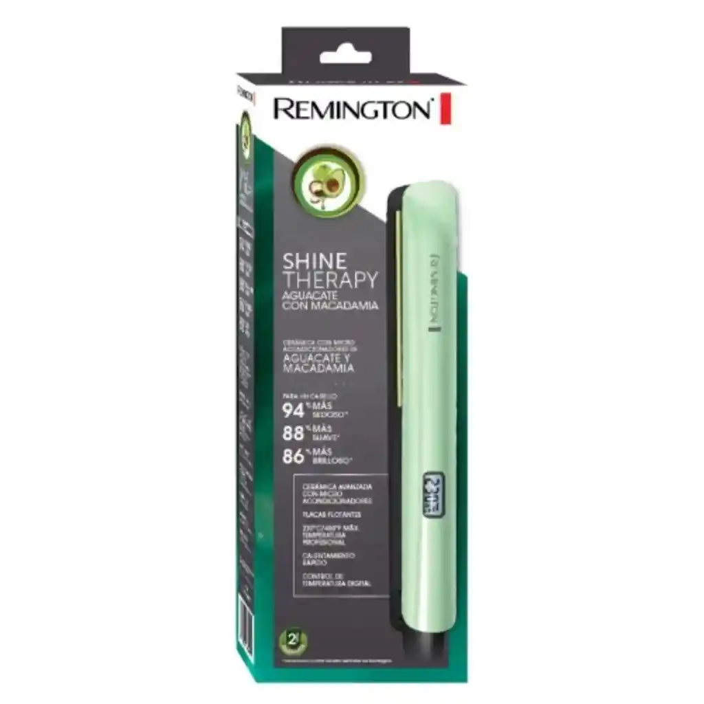Plancha Remington Shine Therapy S9960 Consiente tu cabello con una dosis de brillo y suavidad. La Plancha Remington S9960 Shine Therapy está diseñada para cuidar tu cabello mientras lo alisas, gracias a sus placas de cerámica infundidas con aguacate y macadamia, que liberan microacondicionadores con el calor para un acabado extra liso, sano y radiante. Características principales • Placas recubiertas de cerámica con microacondicionadores de aguacate y macadamia. • Cabello con hasta 86% más de brillo* comparado con planchas estándar de Remington. • Temperatura máxima: 230°C (450°F). • Calentamiento ultrarrápido en solo 30 segundos. • Pantalla digital con controles de temperatura (+/-). • Placas flotantes para un deslizamiento uniforme. • Bloqueo de placas para mayor seguridad. • Apagado automático para tu tranquilidad. • Cable giratorio de 2 metros para total comodidad. • Placas de 1” (2,54 cm) de ancho, ideales para todo tipo de cabello. Garantía y confianza • Producto totalmente nuevo y sellado. • 1 mes de garantía por defectos de fábrica. Si deseas un cabello reluciente, suave y saludable, la Remington Shine Therapy S9960 es tu mejor aliada. Ideal para uso diario, aporta brillo, suavidad y un alisado profesional en minutos. Disponible para entrega inmediata. Ordénala hoy y transforma tu rutina de belleza con Remington.