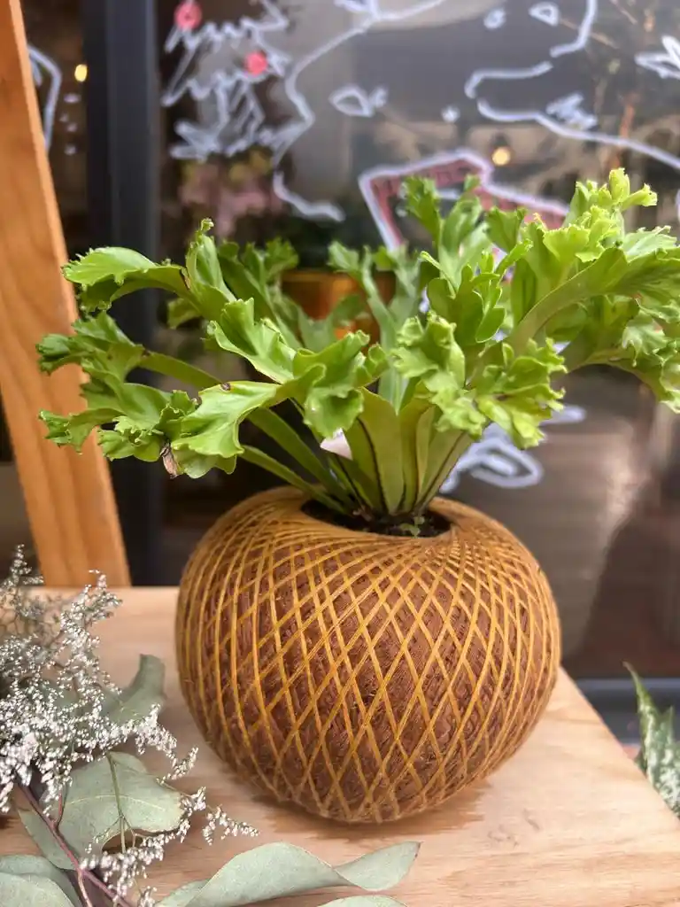 El Kokedama es una forma de bonsai que simboliza la conexión entre el cielo y la tierra, es una forma de expresar el equilibrio entre el ser humano y la naturaleza y el respeto por la vida. El helecho crispy es una planta muy apreciada por la belleza de sus hojas y su resistencia. Es una planta de interior, no le gusta el sol directo. Es perfecta para una mesa de centro.